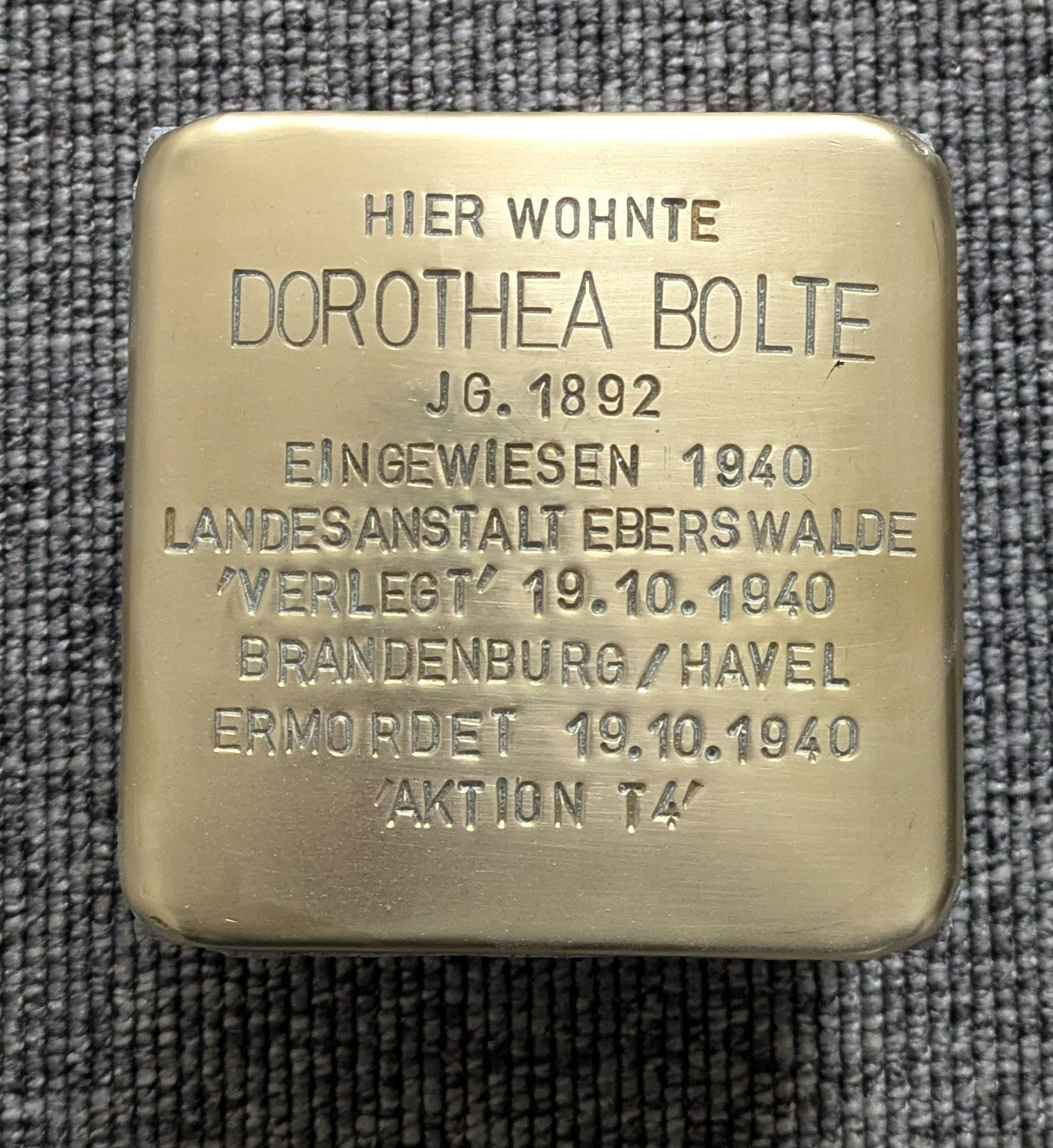 Der Stolperstein hingegen wird im November 2024 gefertigt; die Verlegung solle im April 2025 stattfinden, wie dem iFFF von Seiten der Stolperstein-Initiative Friedrichshain/Kreuzberg im Oktober schriftlich beschieden wurde. Die Finanzierung des Stolpersteins für Dorothea Bolte erfolgt via Sponsoring.